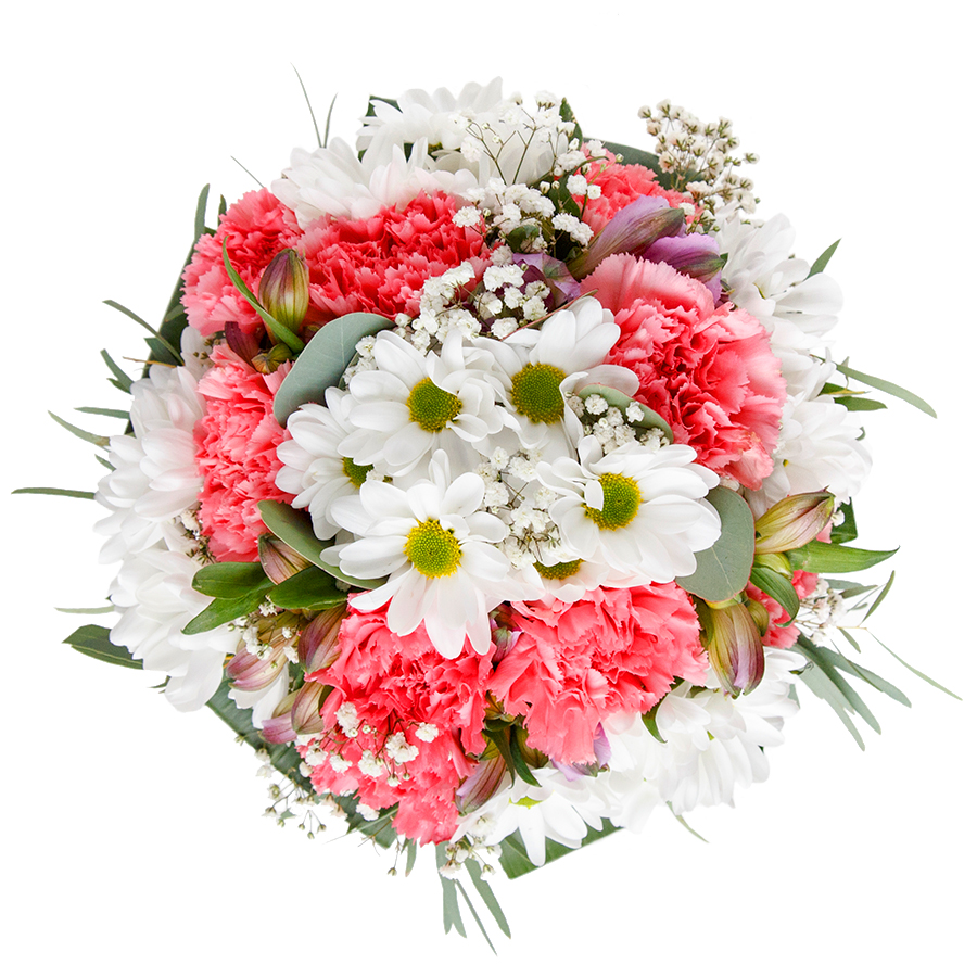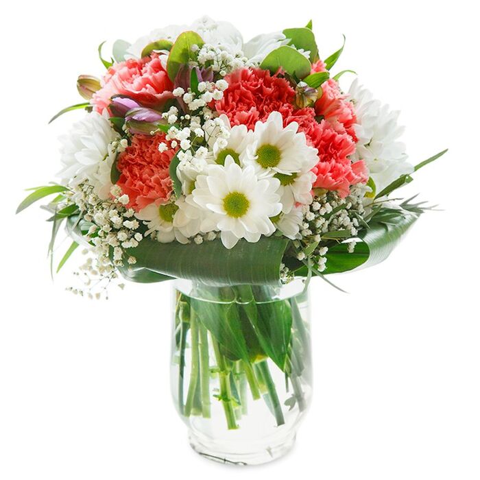 Elevate any occasion with our luxurious and unique flower arrangement. This seasonal bouquet showcases an elegant mix of snow-white chrysanthemums, delicate gypsophila, and soft light pink carnations, beautifully enhanced with lush aspidistra leaves.